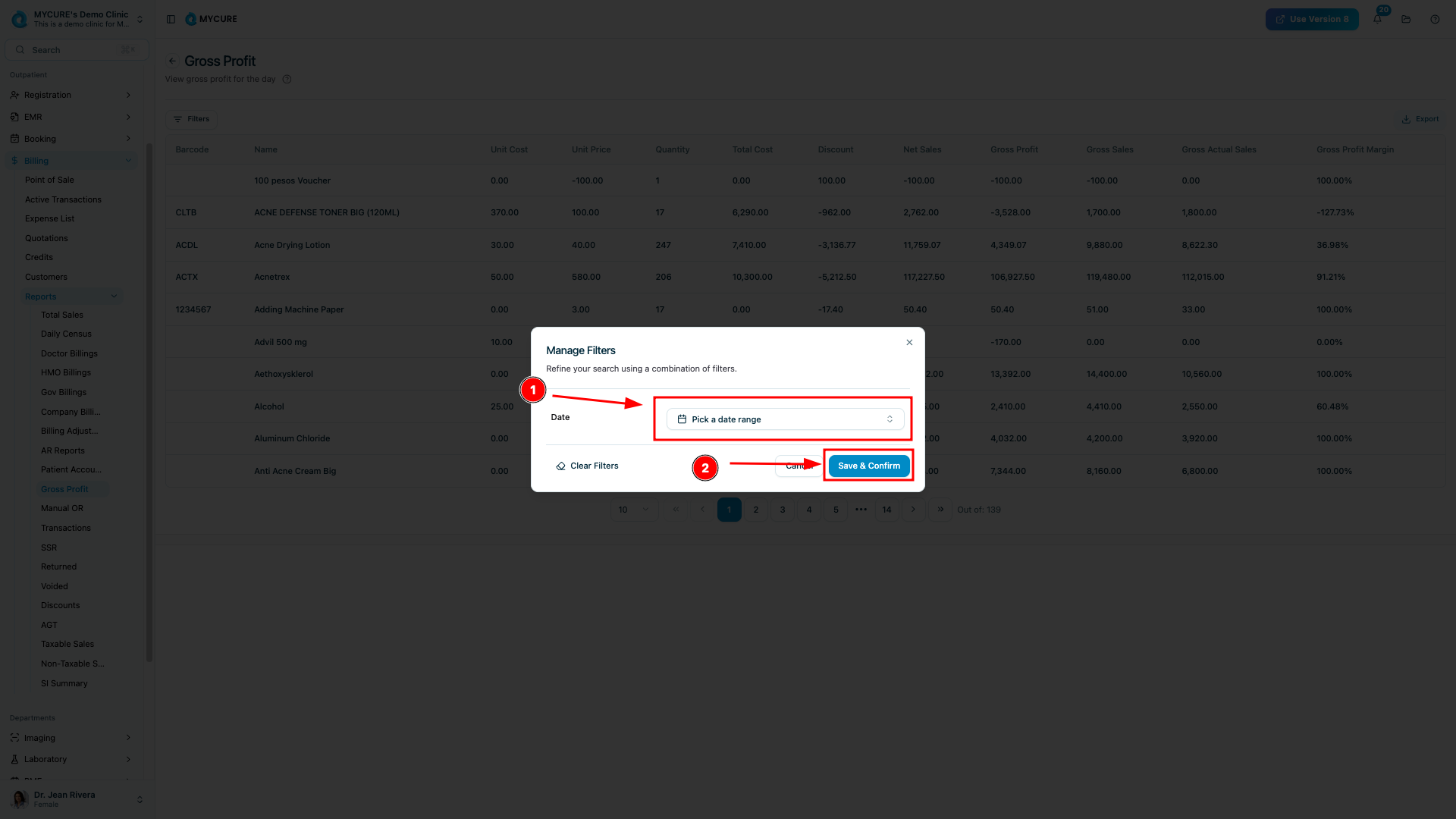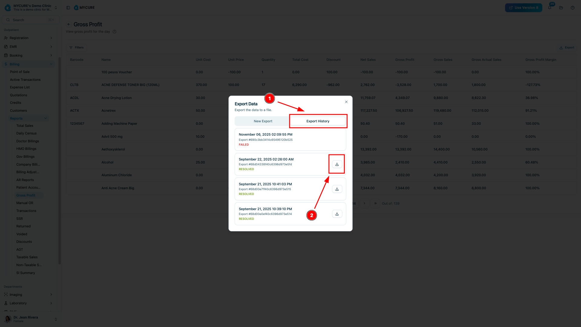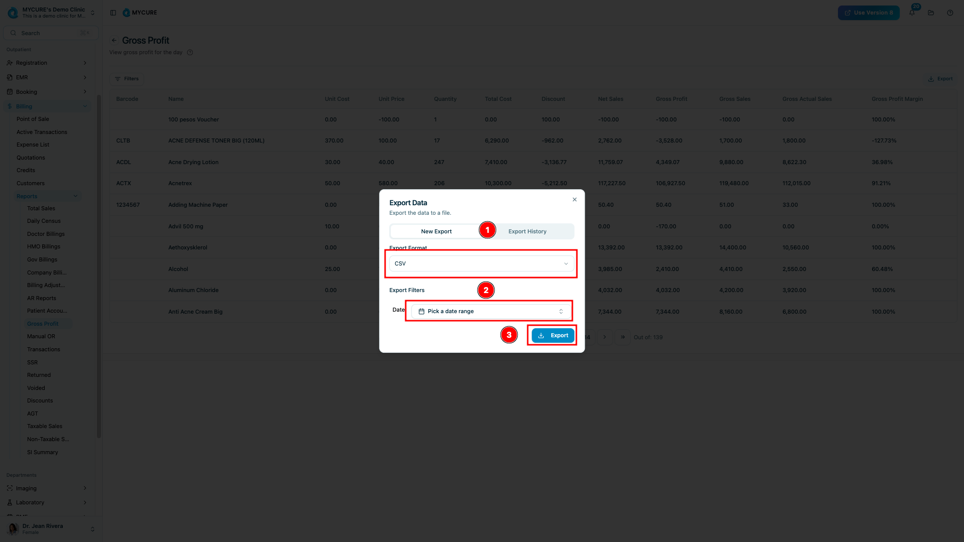 This tutorial will guide you through accessing, filtering, and exporting Gross Profit reports in the MYCURE system. The Gross Profit report is an essential financial tool that helps you track revenue, costs, and profit margins across different time periods.