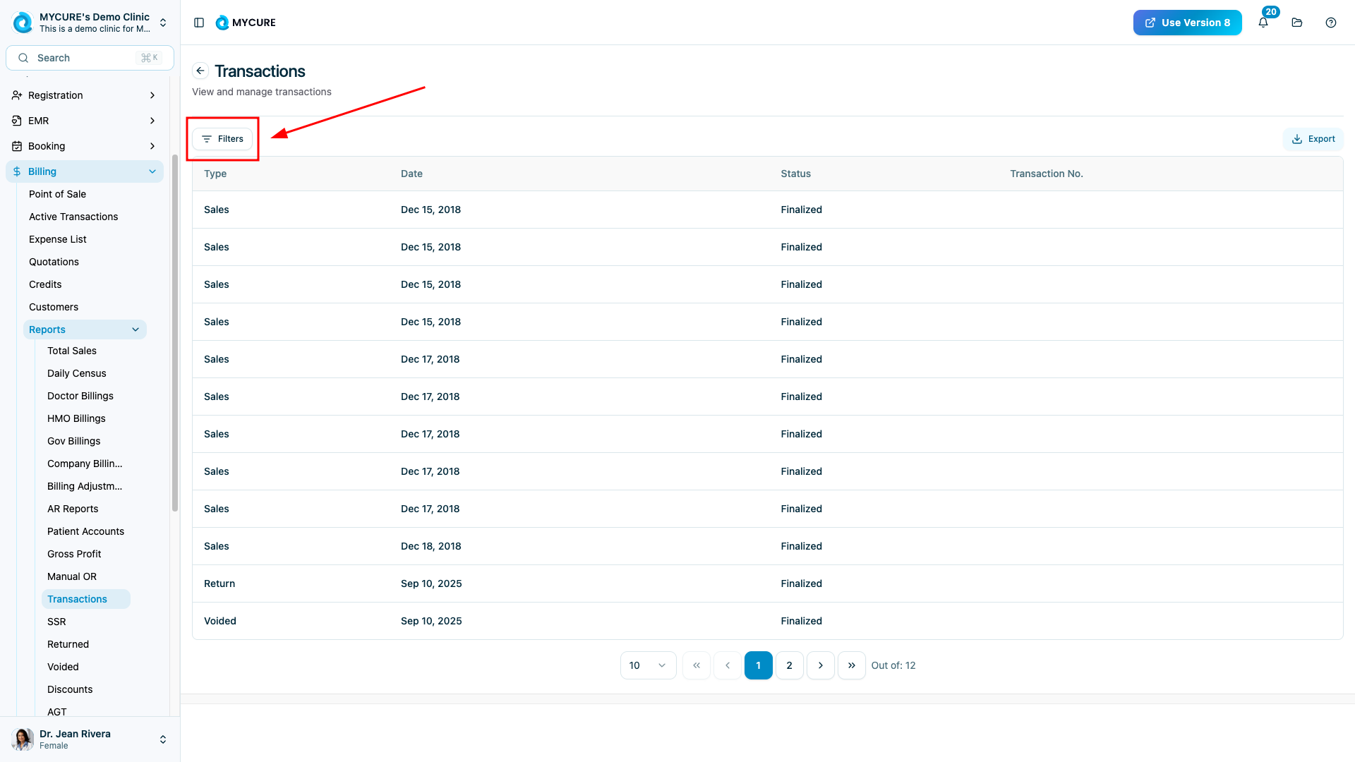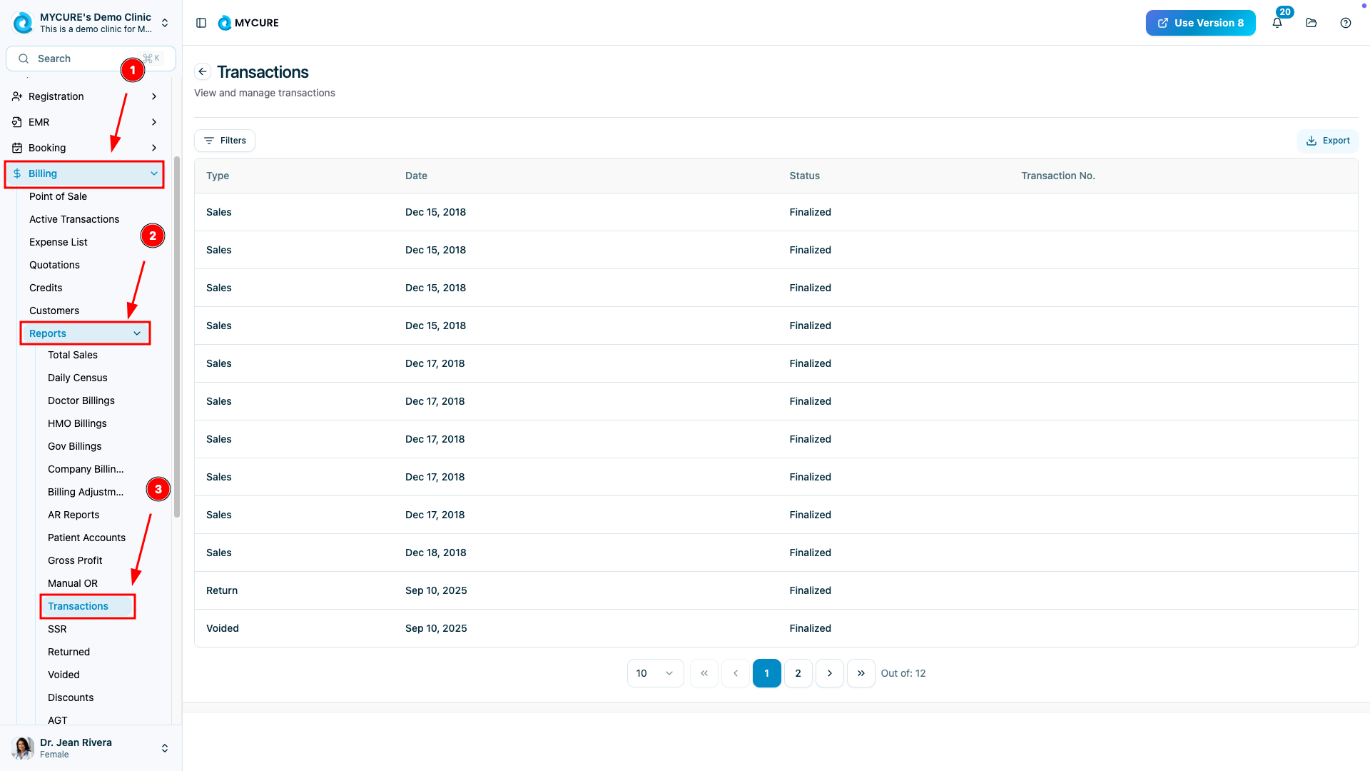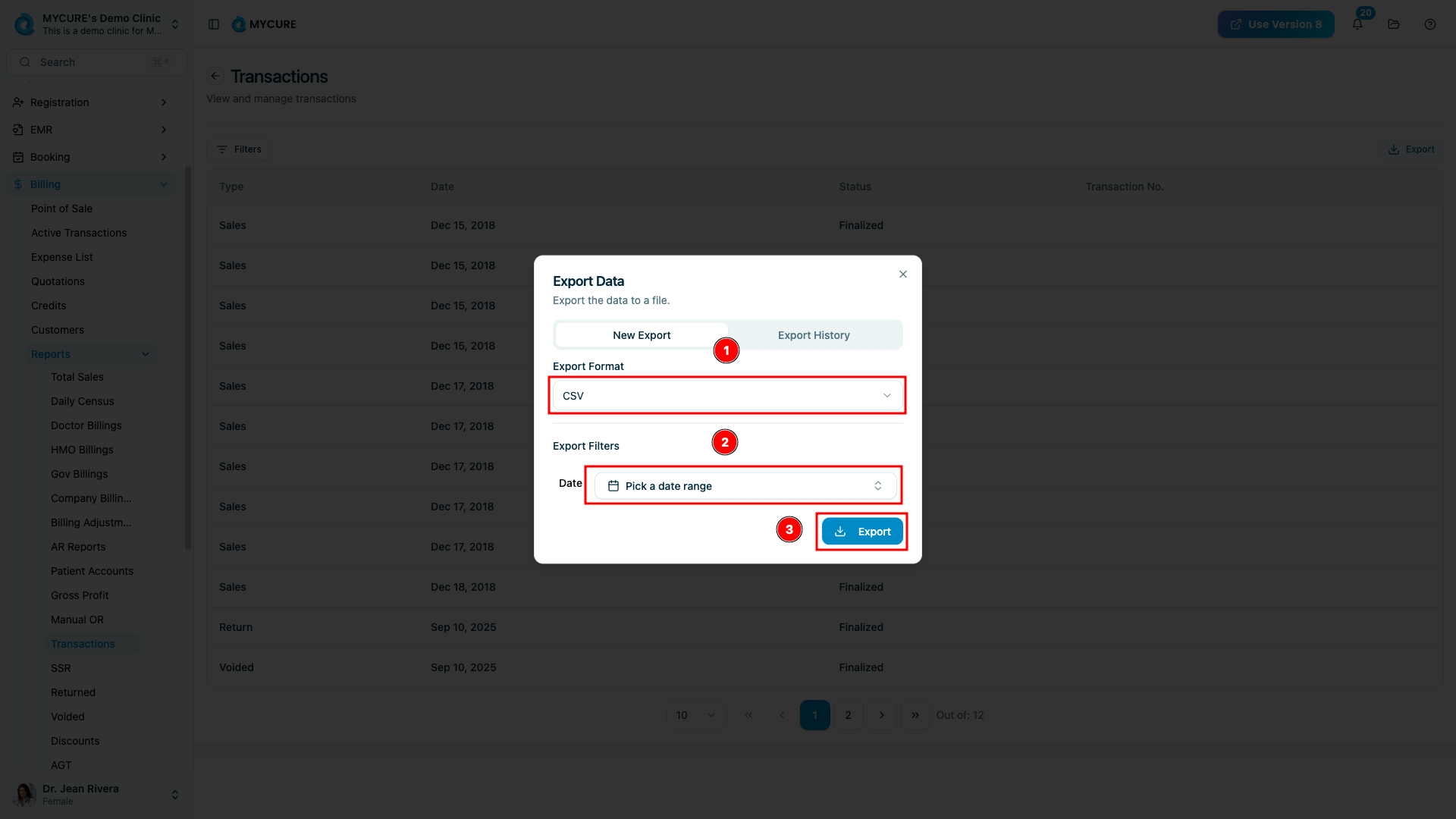 Transaction Reports in MYCURE v10 provide a comprehensive view of all billing transactions in your clinic. This tutorial will guide you through accessing, filtering, and exporting transaction data to help you track financial activities and prepare reports for accounting purposes.