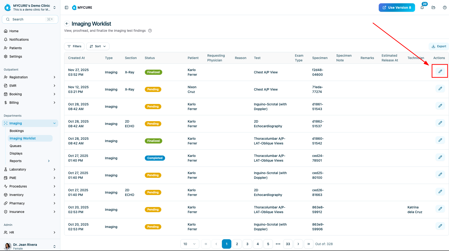 Browse through the worklist and click on the specific imaging order record you want to process. The selected record will be highlighted, indicating it is active and ready for action.