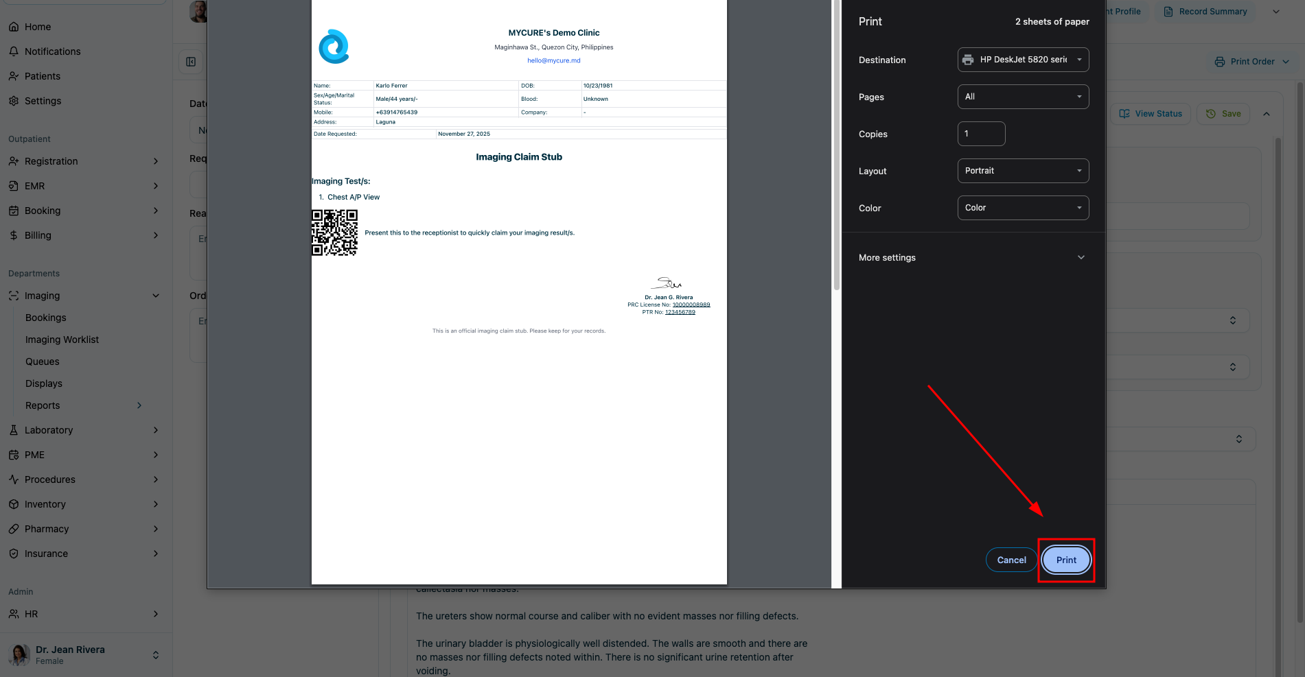 With the desired record selected, locate and click the "Print Order" button. This will display printing options for the selected imaging order.