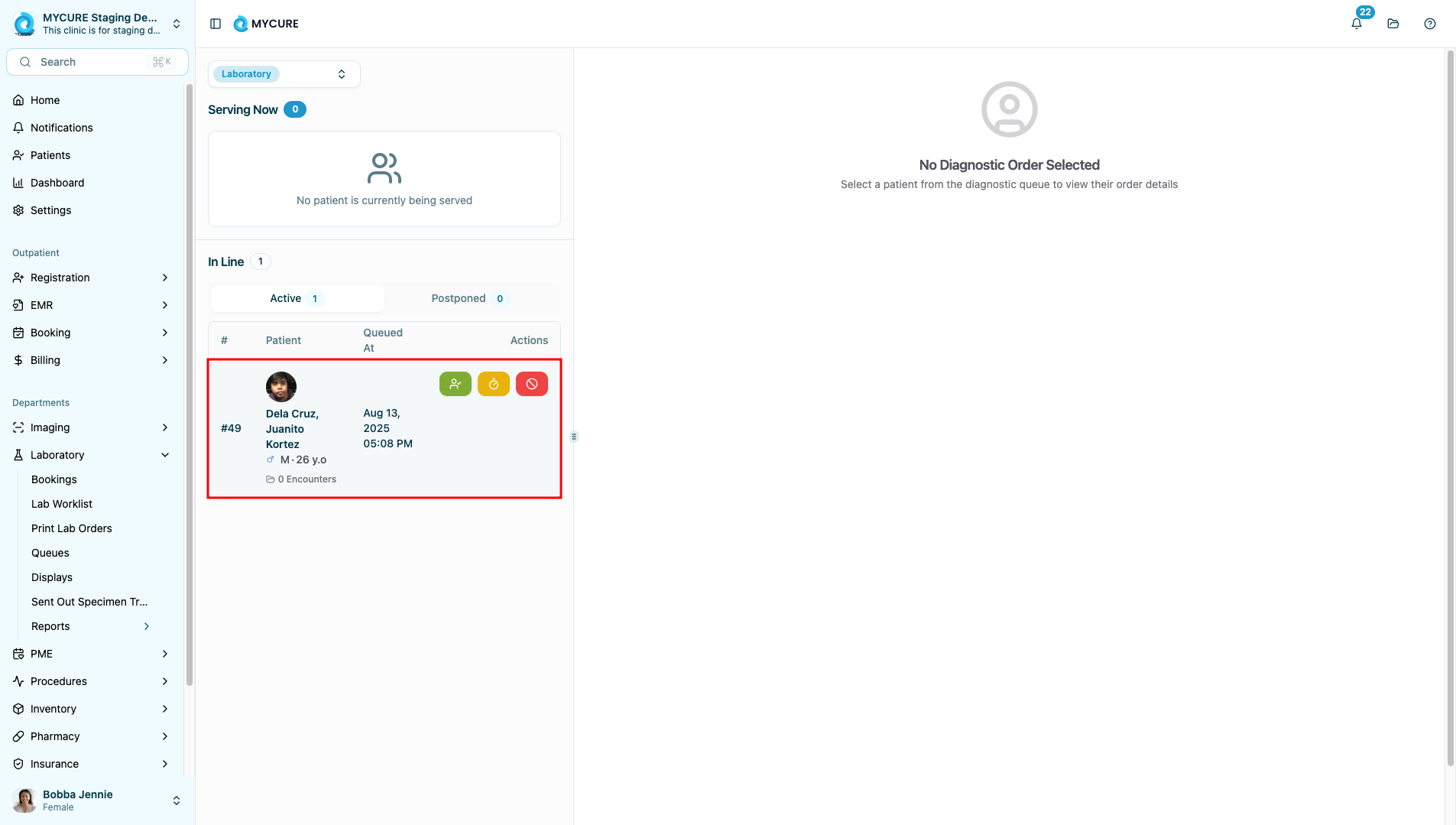 In the laboratory queue list, locate and click on the patient record you need to postpone. The selected patient's row should become highlighted to indicate it has been selected.