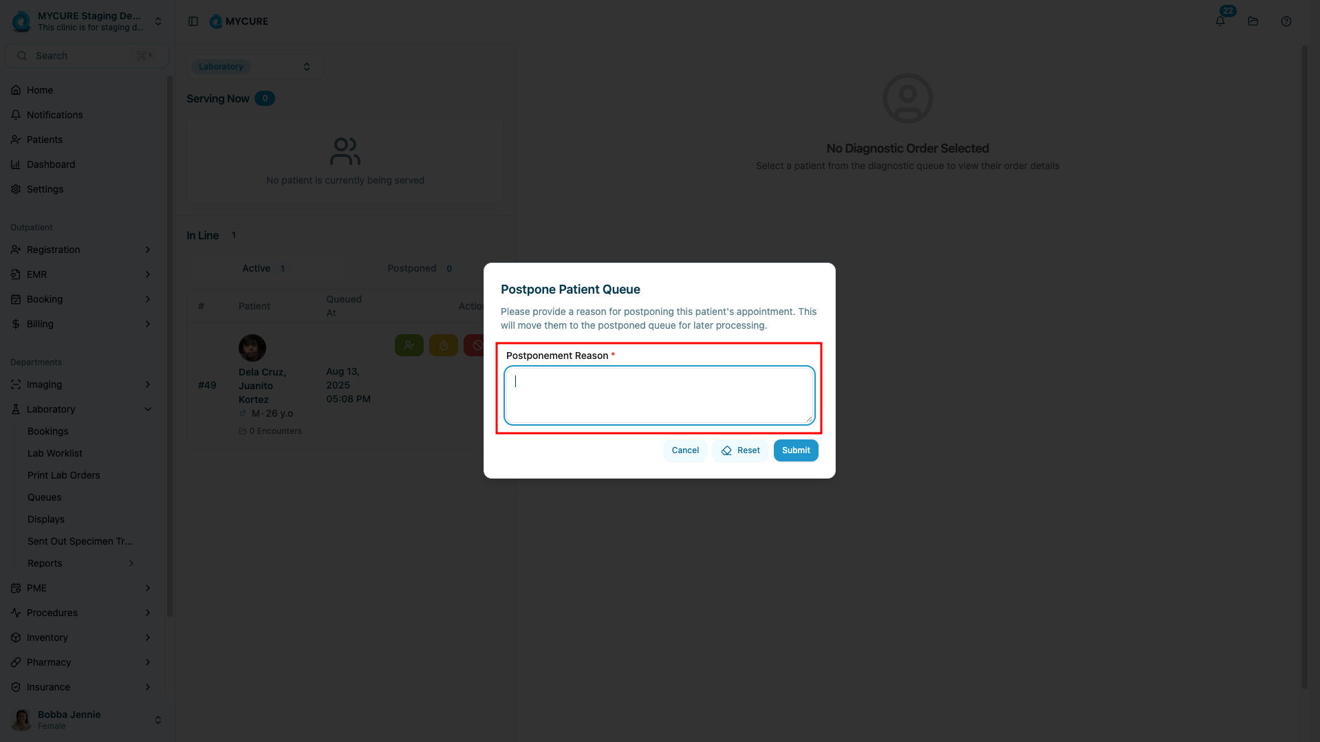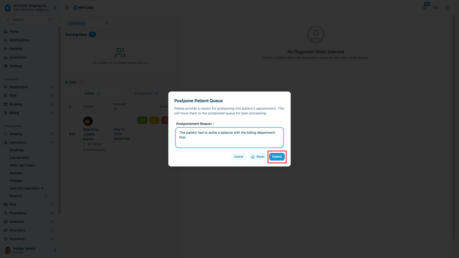 After entering a reason, click the "Submit" button to confirm the postponement. The system will process your request and remove the patient from the active queue.