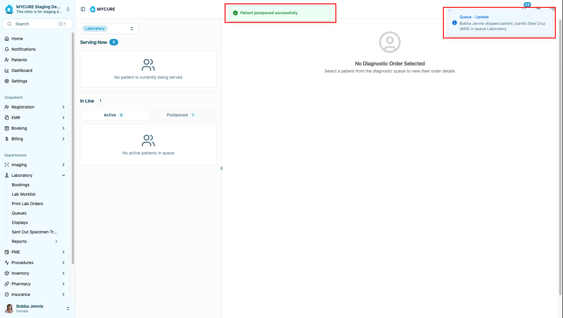 Patient still appears in queue after postponement - Refresh your browser page. If the patient still appears, try logging out and back in to reset your session cache.