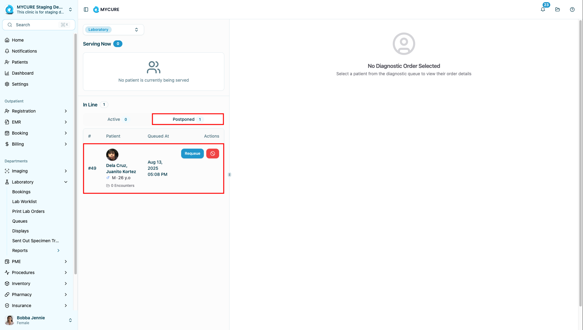 Postpone option is grayed out - Verify you have the proper permissions for laboratory queue management. Contact your system administrator if you believe this is an error.