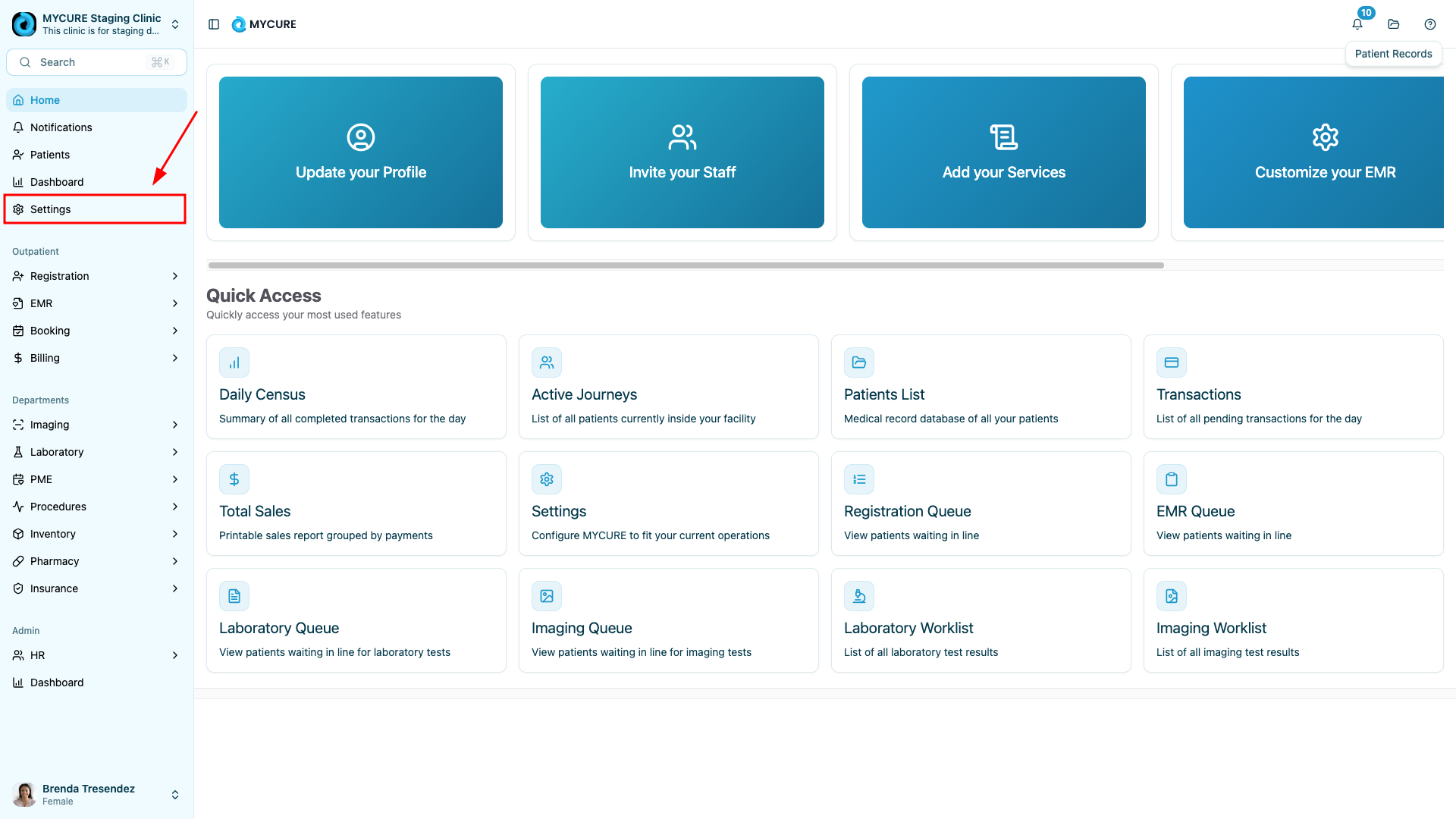 Click on "Settings" from the navigation bar located at the left of your MYCURE CMS. This will open the main settings menu where you can manage various aspects of your account.