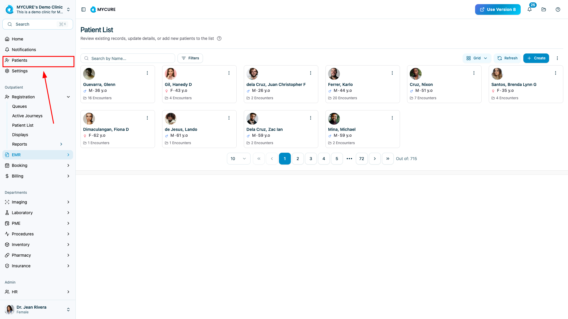 Navigate to the main dashboard and click on the "Patients" section in the navigation menu. This will display all patients currently registered in the system.