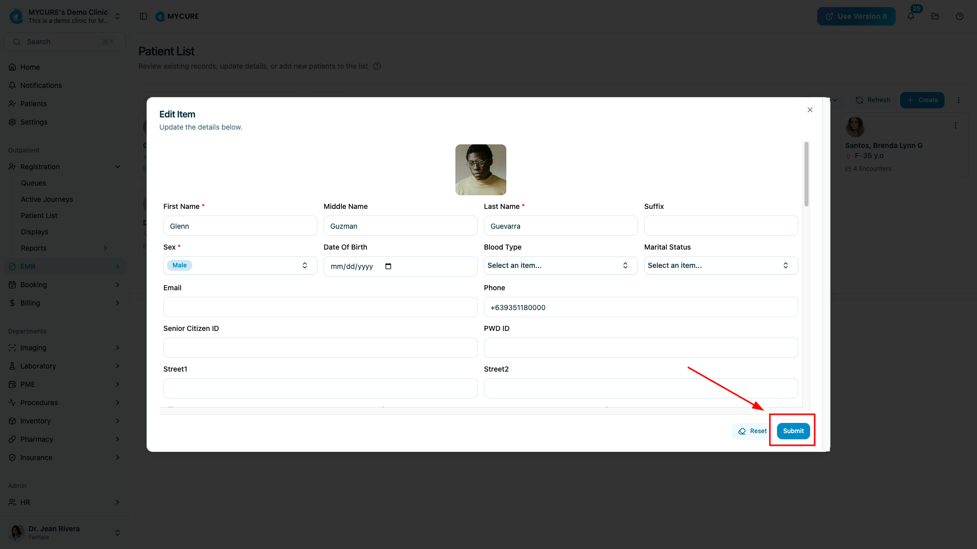 After making all desired changes, click the "Submit" button at the bottom of the form. The system will process your changes and, if successful, return you to the patient card view with the updated information displayed.