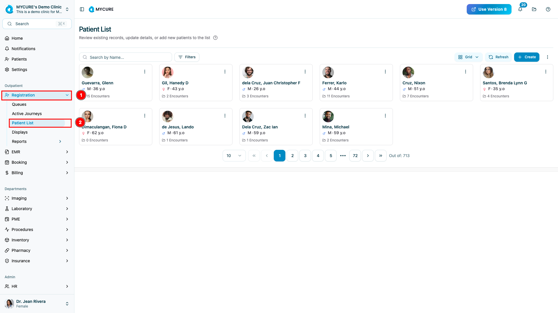 Go to the main dashboard and click on the "Patients" section in the main navigation menu. This will redirect you to the Patient List page under Registration which displays the list of all existing patients in the system.
