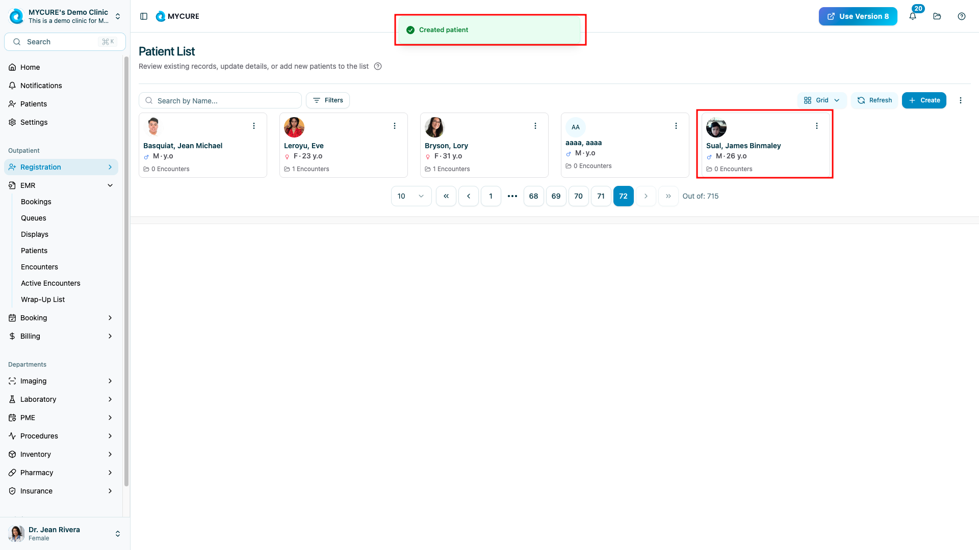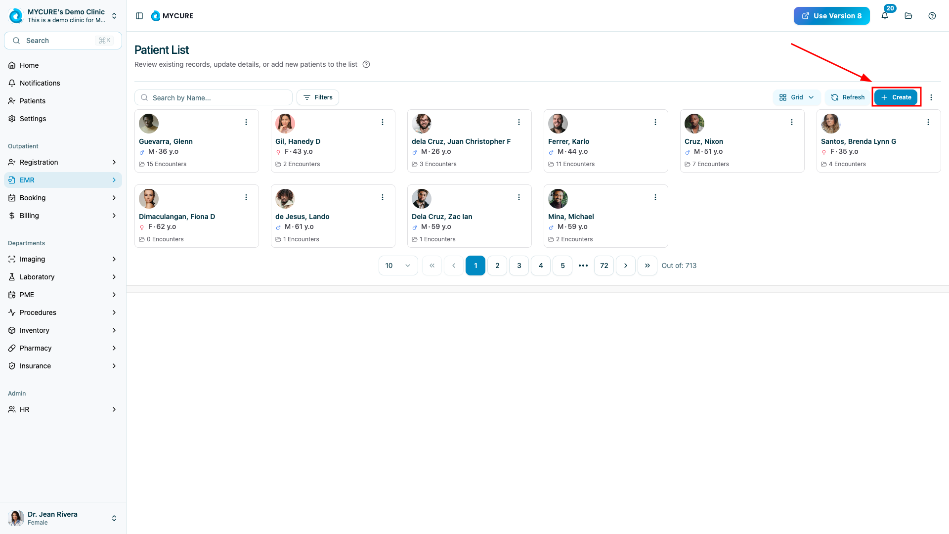 Look for the "Create" button, typically located at the top-right corner of the patient list screen. Click this button to open the new patient registration form.