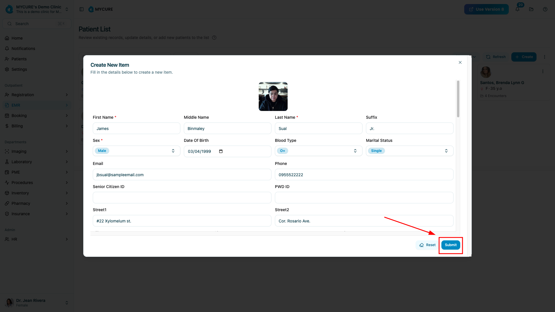 After filling out all required information, review the form for accuracy and then click the "Submit" button at the bottom of the form. The system will process your request and, if successful, will add the new patient to your patient list.