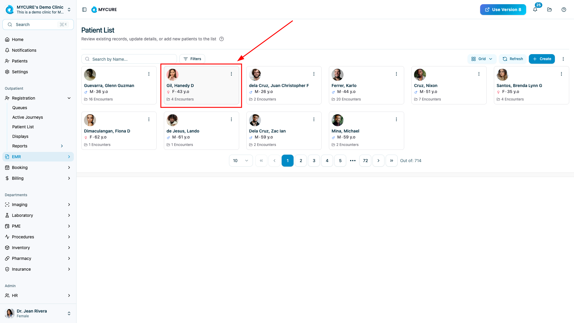 Locate and click on the patient record you want to keep as the primary record. This will open the patient's profile card with their information.