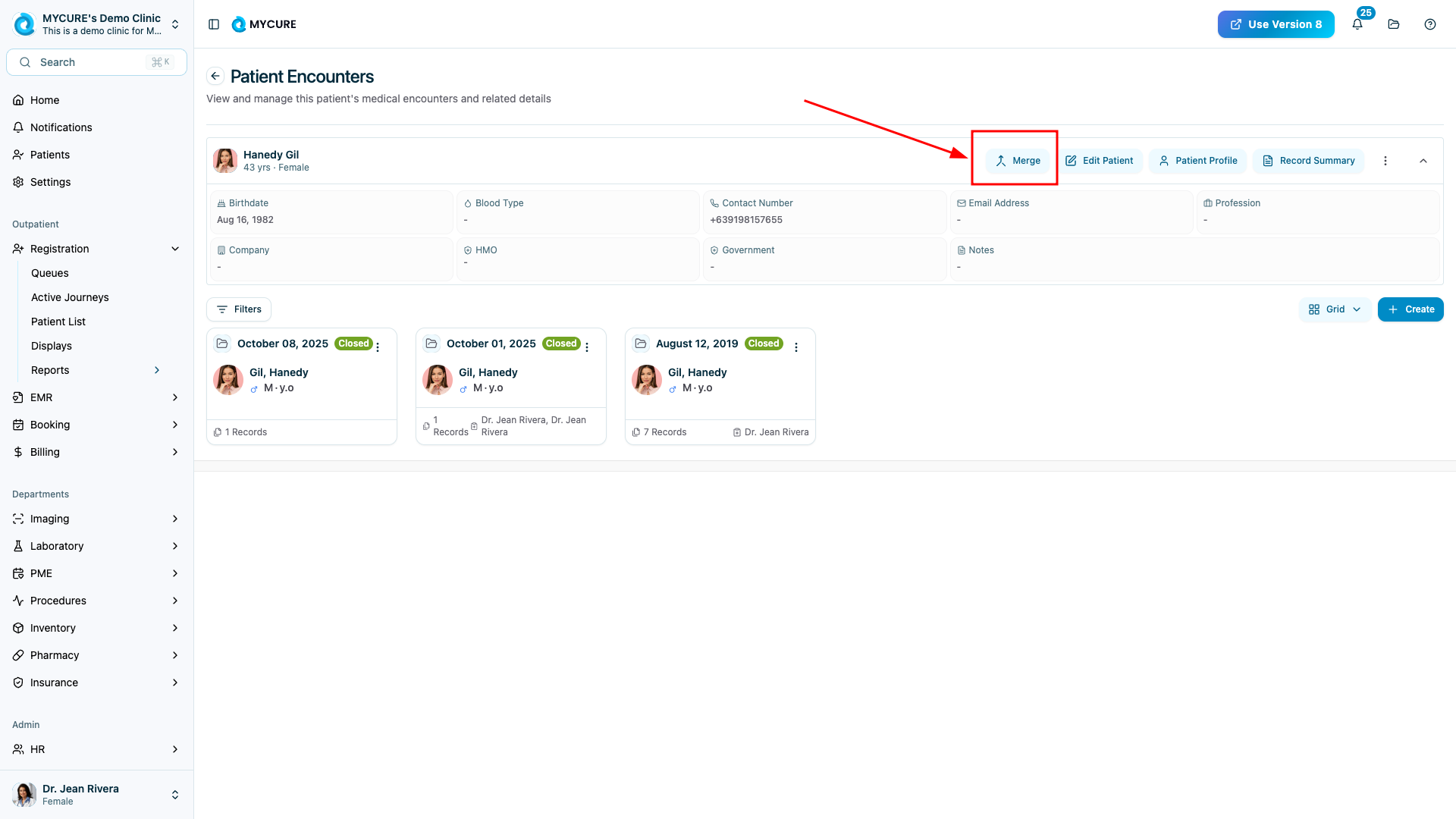 Within the patient card, locate and click the "Merge" button. This is found directly on the patient card interface.