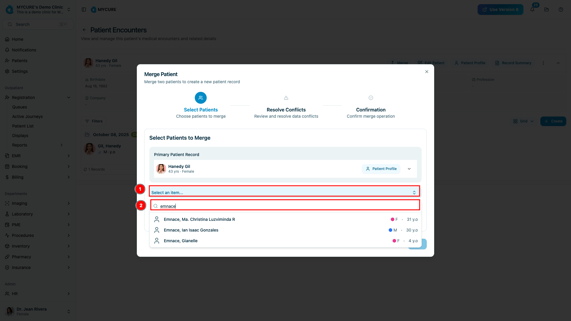 In the merge interface, use the search field to find the patient record you wish to merge with the primary record. Enter the patient's name, ID, or other identifying information and select them from the search results.