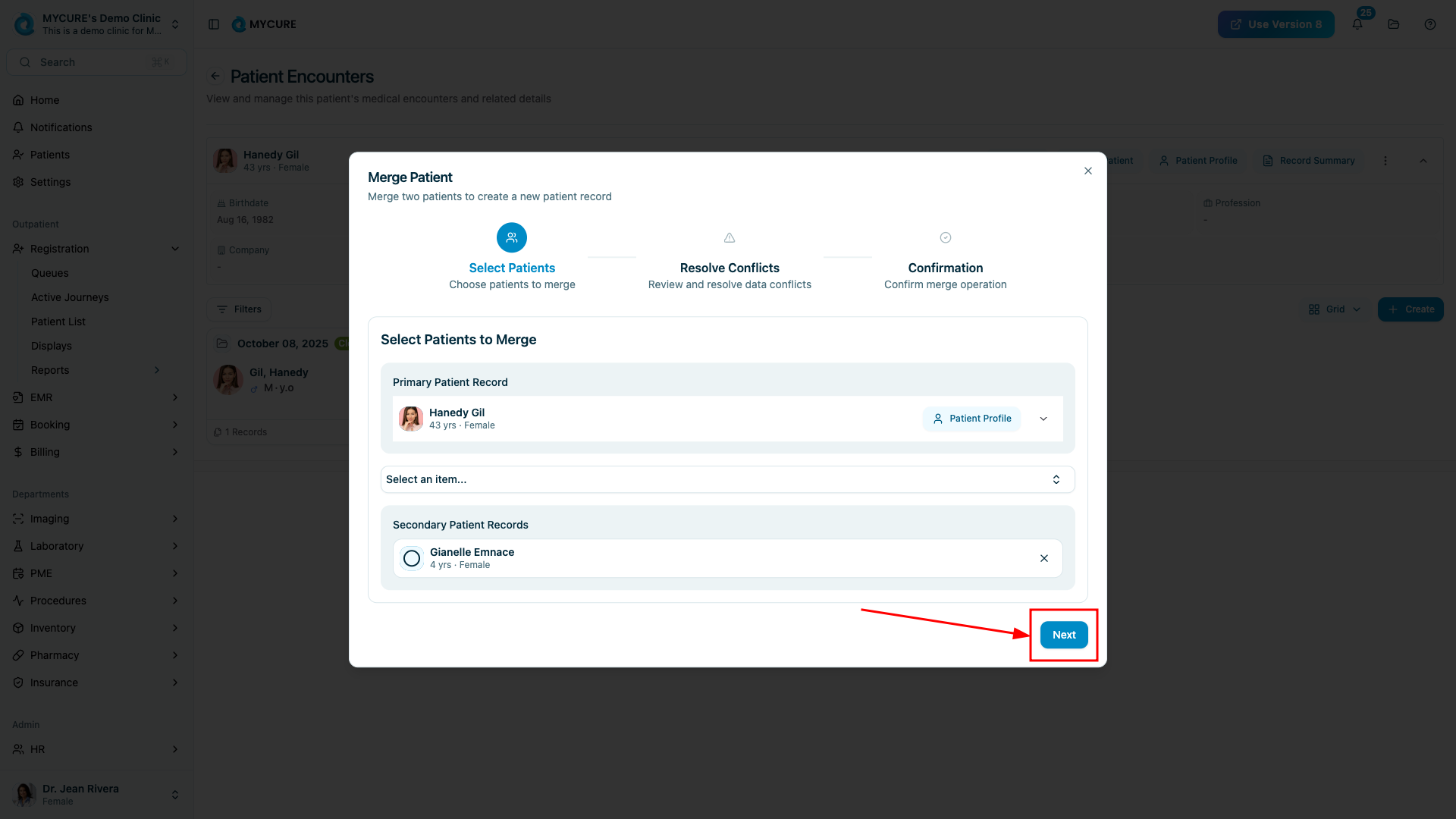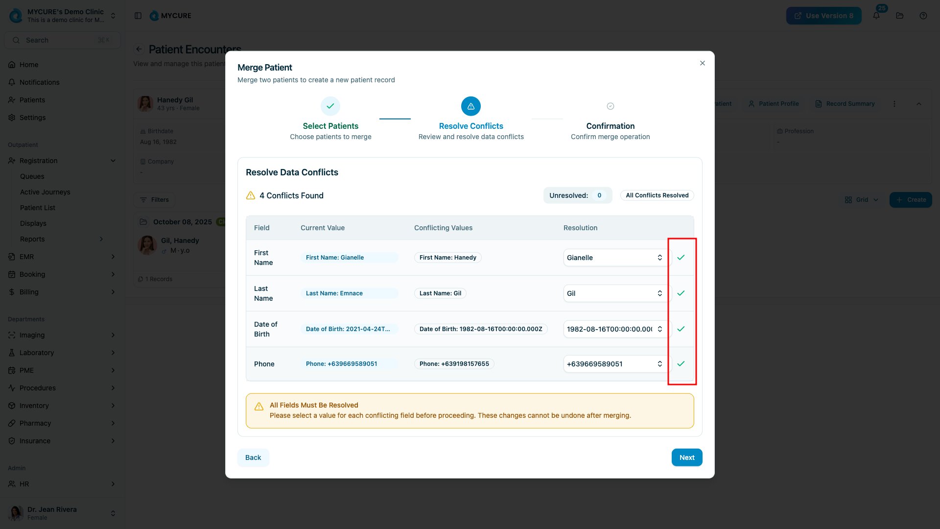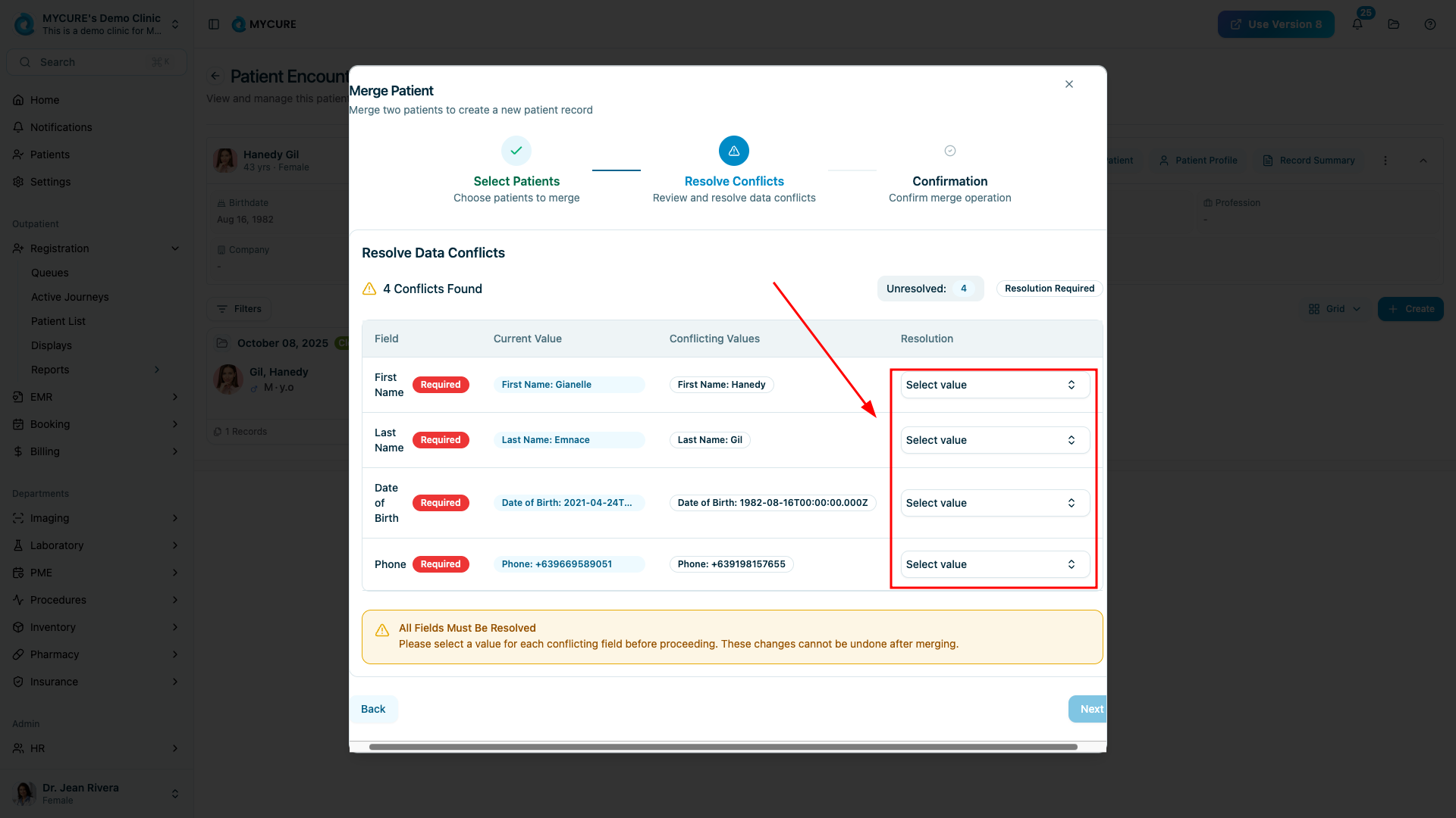 The system will display both patient records side by side for comparison. For any conflicting information, select the correct data in the "Resolution" column by clicking on the appropriate value. Fields without conflicts will be automatically merged.