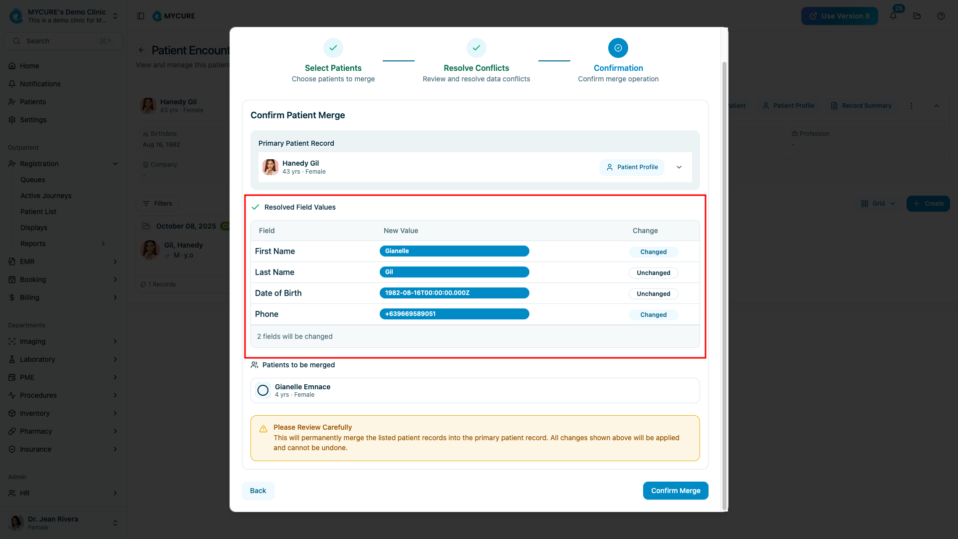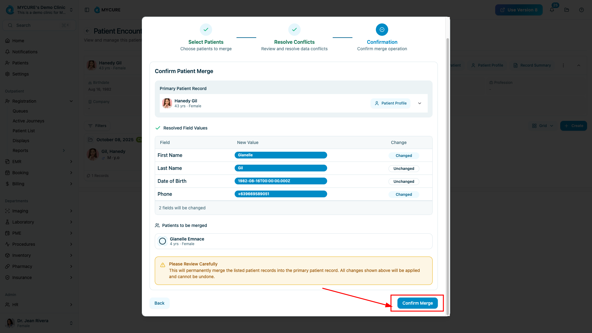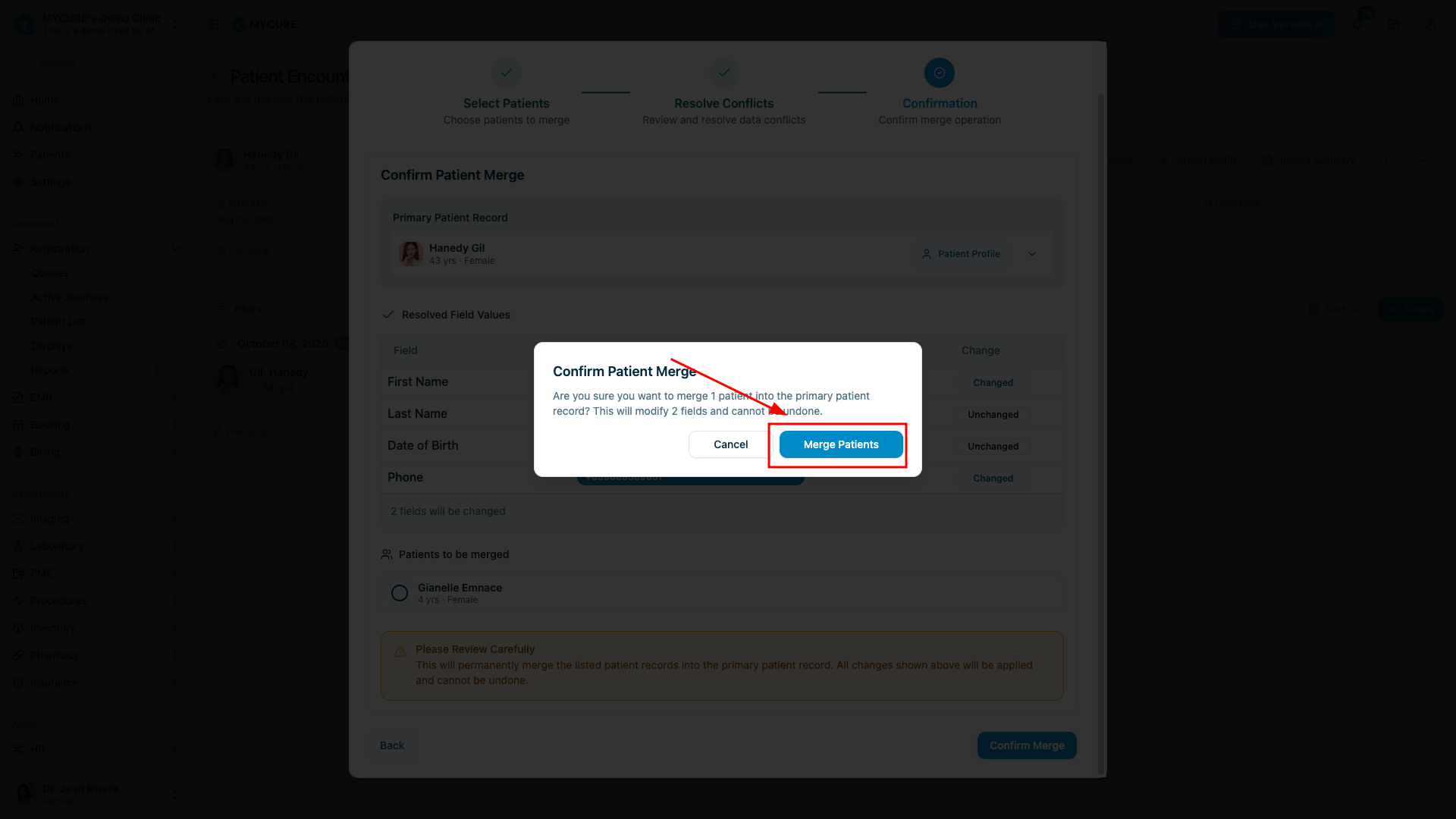 Once you've verified the details are correct, click the "Confirm Merge" button. A final confirmation dialog will appear as a safety check. Click "Merge Patients" to complete the process.