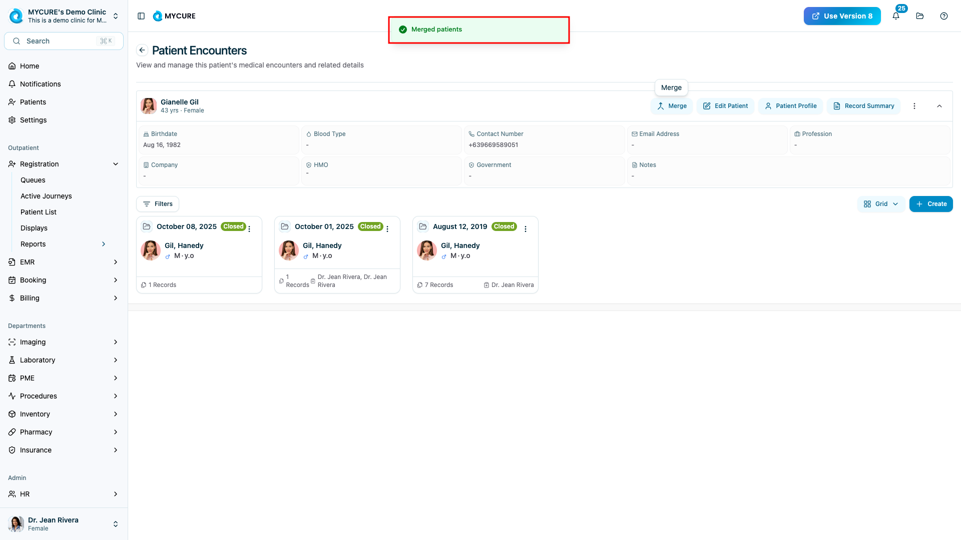 The merge operation combines all medical history, appointments, prescriptions, and other clinical data from both records into the primary record.